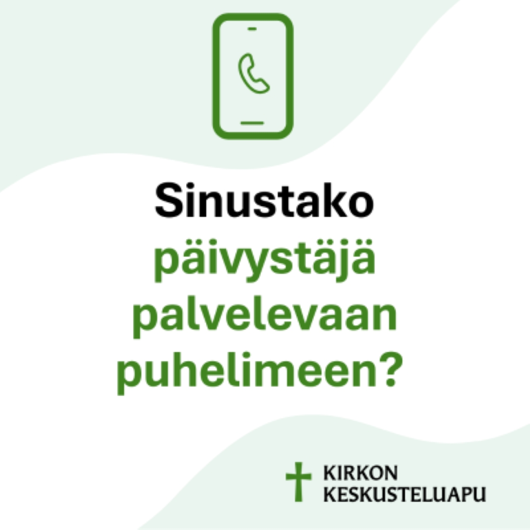 Tule kuuntelijaksi lähimmäiselle! Emme etsi auttamisen ammattilaisia vaan rinnalla kulkijoita ja lähimmäisiä. Haemme vapaaehtoisia päivystäjiä Päijät-Hämeen ja Mäntyharjun alueilta. Kirkon keskusteluapuun ottaa yhteyttä monenlaisissa elämäntilanteissa olevia ihmisiä. Ennen ensimmäiseen yhteydenottoon vastaamista sinulle annetaan valmiudet kohdata erilaisia yhteydenottajia. Tehtävä on itsenäinen ja voit päivystää joko kotona tai seurakunnan tilassa. Päivystysvuoro (2 - 4 h) on noin kerran kuussa. Tehtävän tukena on päivystysryhmän säännölliset työnohjaukselliset tapaamiset sekä monipuolinen täydennyskoulutus. Seuraava valmennuskurssi alkaa syksyllä 2026. Haastattelemme uudet vapaaehtoiset ennen valmennuskurssia viikoilla 38-39. Valmennuskurssi: lauantaina 3.10. klo 9.30-15 ja arki-iltoina 13.10. / 28.10. / 4.11. / 11.11. klo 16 - 19.30. Täytä tietosi 15.9.2026 mennessä, niin sovin kanssasi haastatteluajan. Palveleva puhelin on auki joka päivä klo 18 - 24 ja palveleva chat ma - pe klo 16 - 20. Palvelevan nettikirjeen voi kirjoittaa milloin vain ja päivystäjä vastaa nettikirjeeseen sovitulla vuorollaan. Lue lisää: https://evl.fi/apua-ja-tukea/kirkon-keskusteluapu/